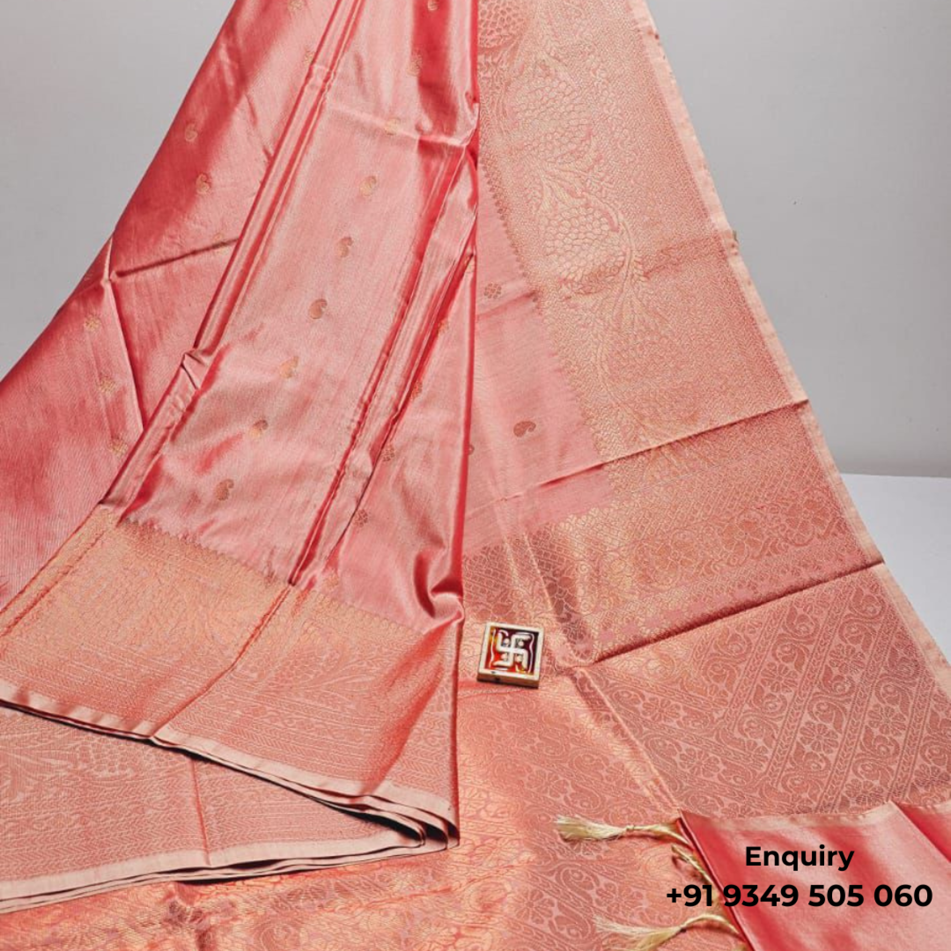 Radiate charm in this vibrant coral peach Kanjivaram saree featuring intricate golden zari detailing. The perfect pick for festive functions, mehendi, or sangeet nights.