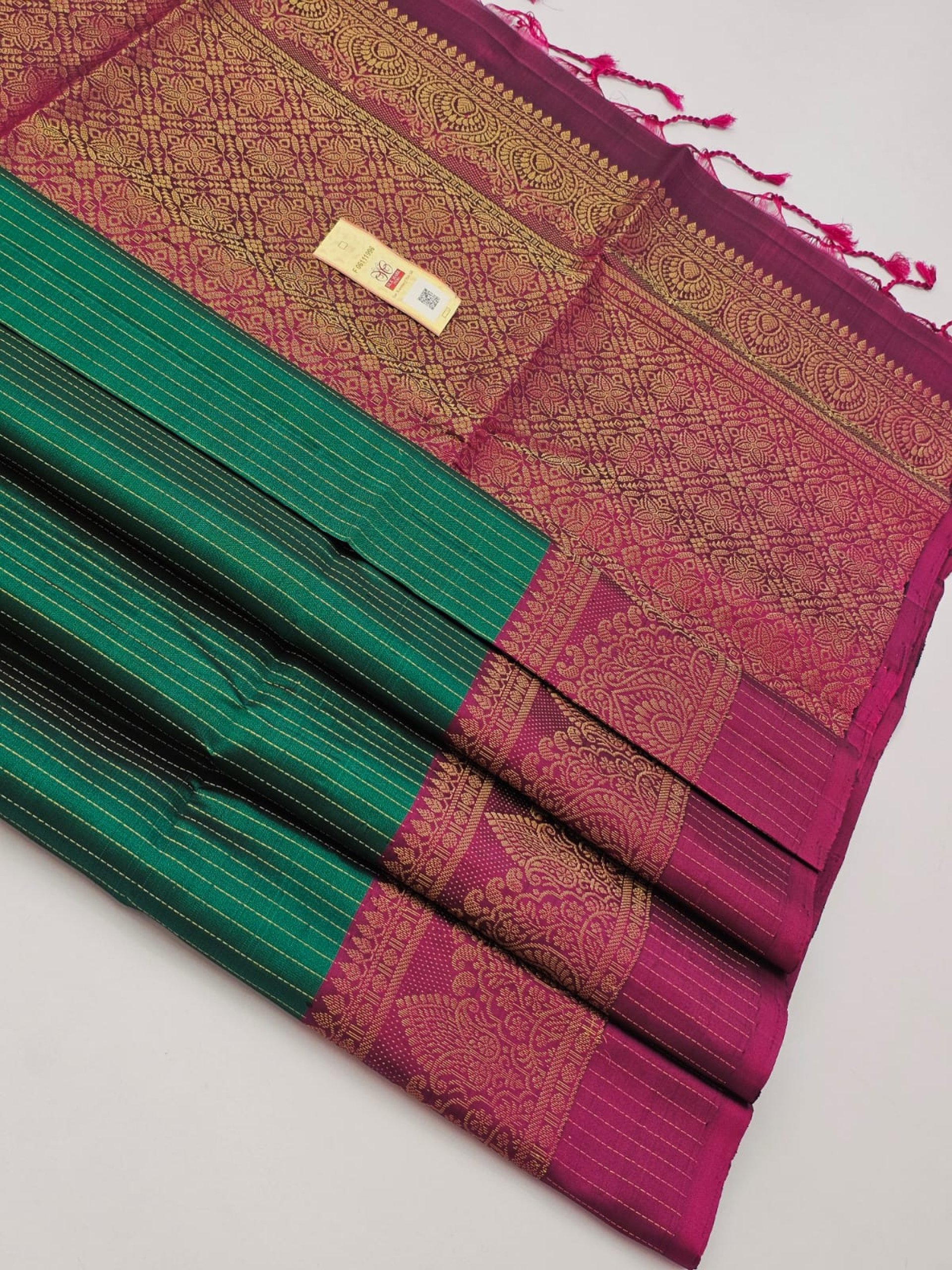 Pure Kanchipuram Silk Saree –Emerald Green & Plum Contrast with Golden Zari Detailing