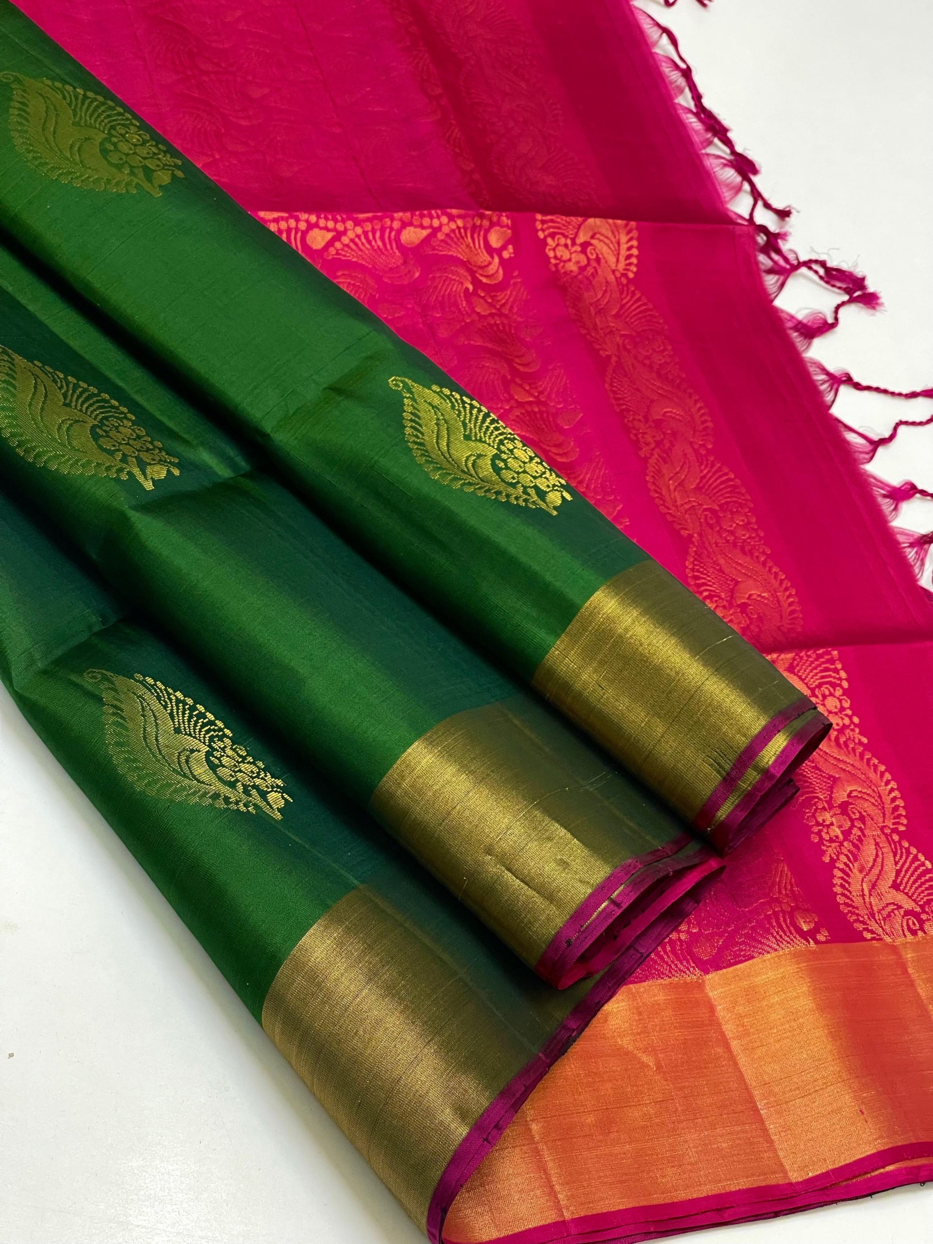 A stunning blend of Emerald Green and Magenta Pink, this silk saree is accentuated with gold border work. Perfect for those who love contrast and vibrant traditional wear.