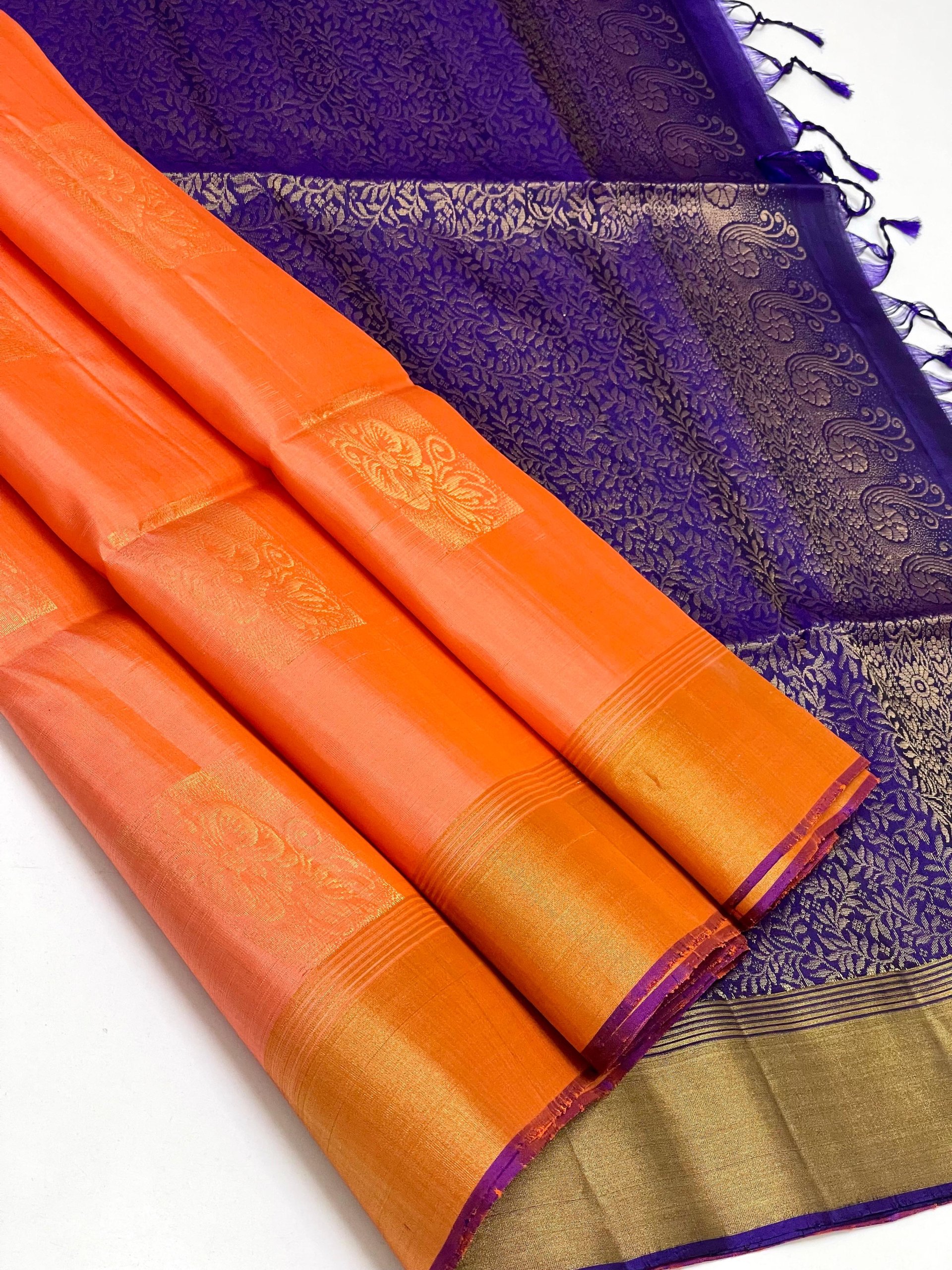 With a glowing mix of tangerine orange and purple pallu, this saree radiates energy and tradition effortlessly.