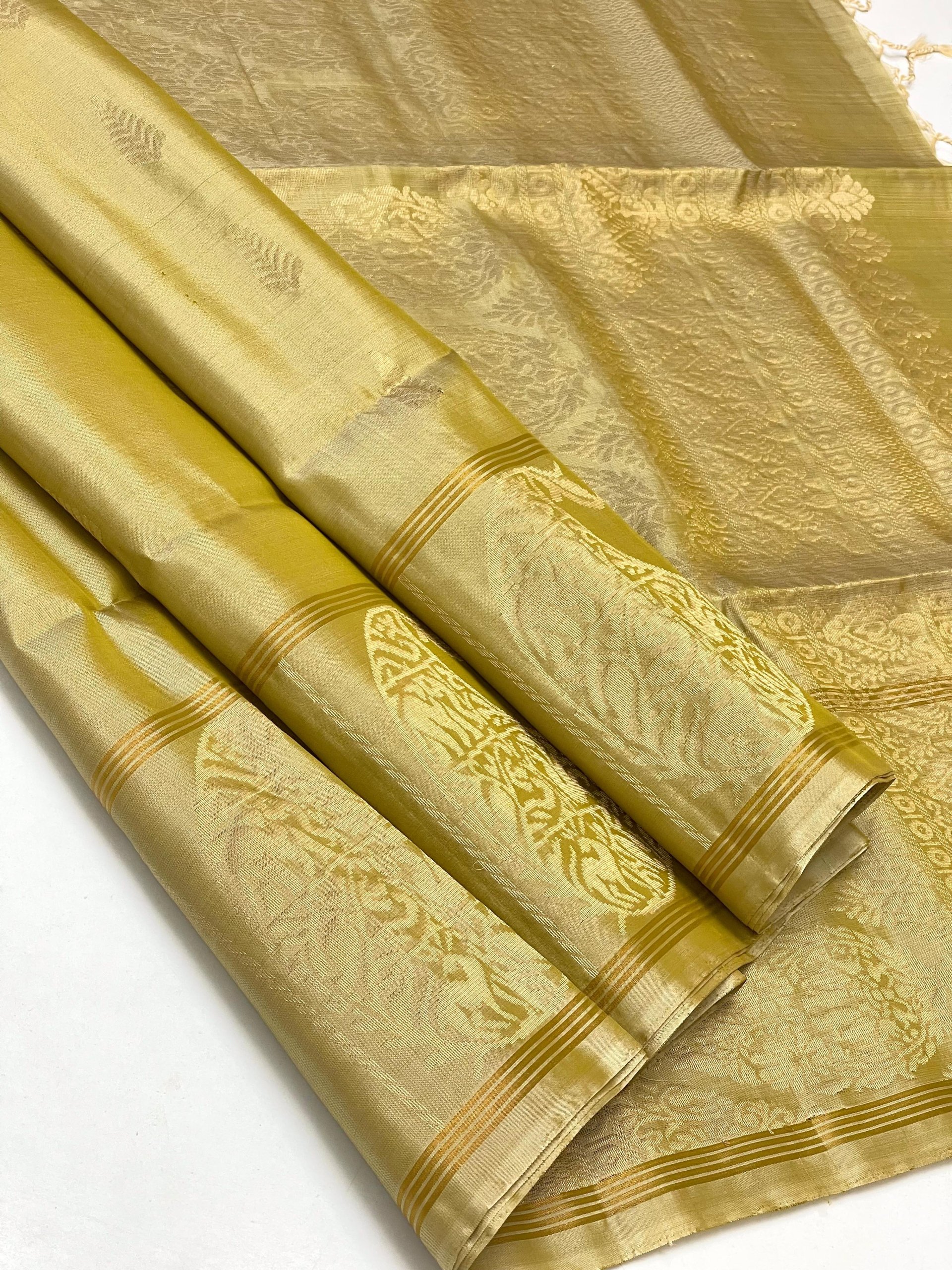 Elegant and divine, this Golden Yellow Soft Silk Saree radiates opulence with its all-over woven design and subtle shimmer. A refined choice for day weddings or spiritual ceremonies.