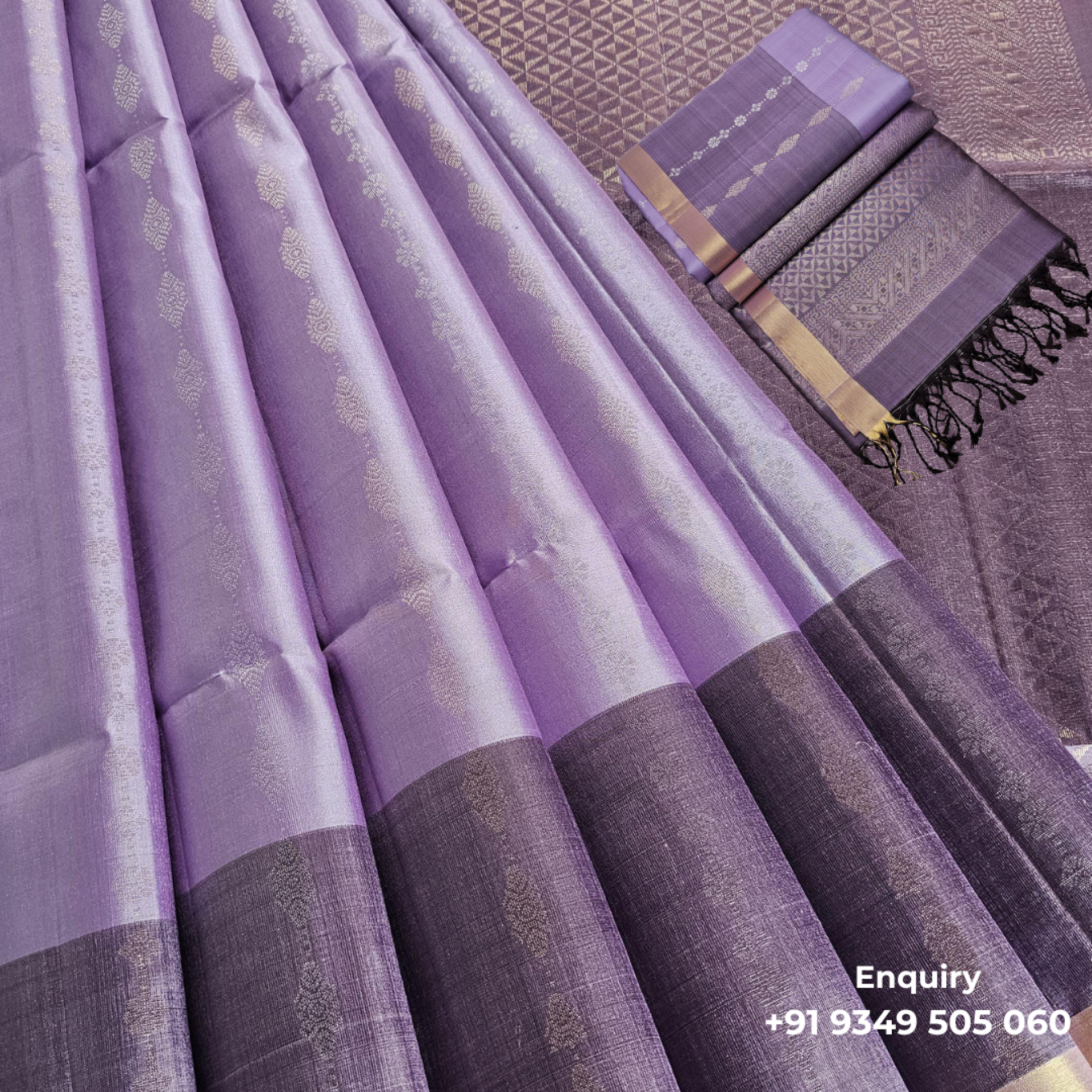 This lavender silk saree is a delicate combination of color and craftsmanship. Designed with silver floral zari buttas and a deep grey border, it’s both regal and refined. An excellent choice for receptions, family functions, or gifting.