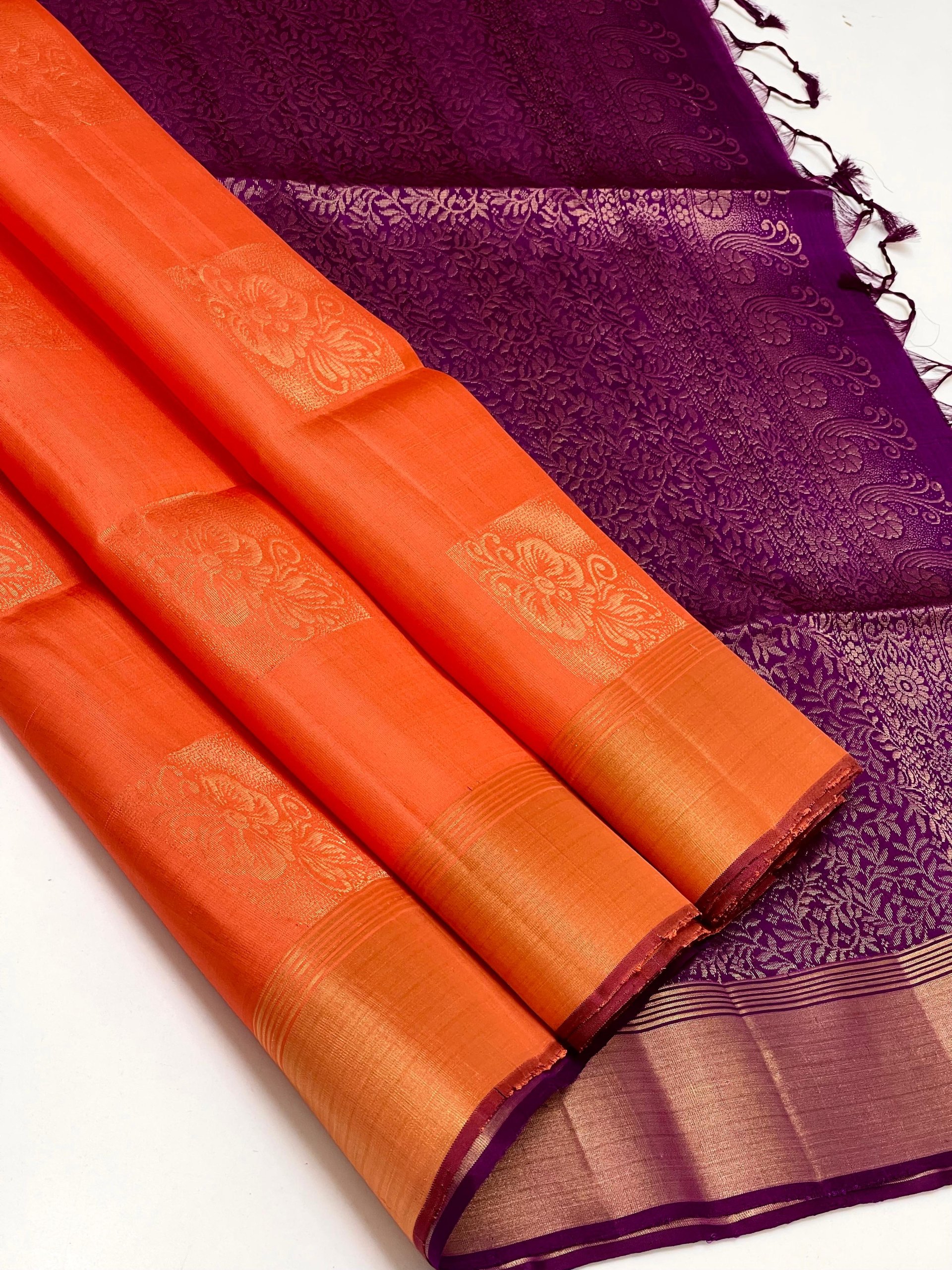 Bright orange hue paired with a regal purple pallu makes this saree an ideal pick for radiant festive appearances.