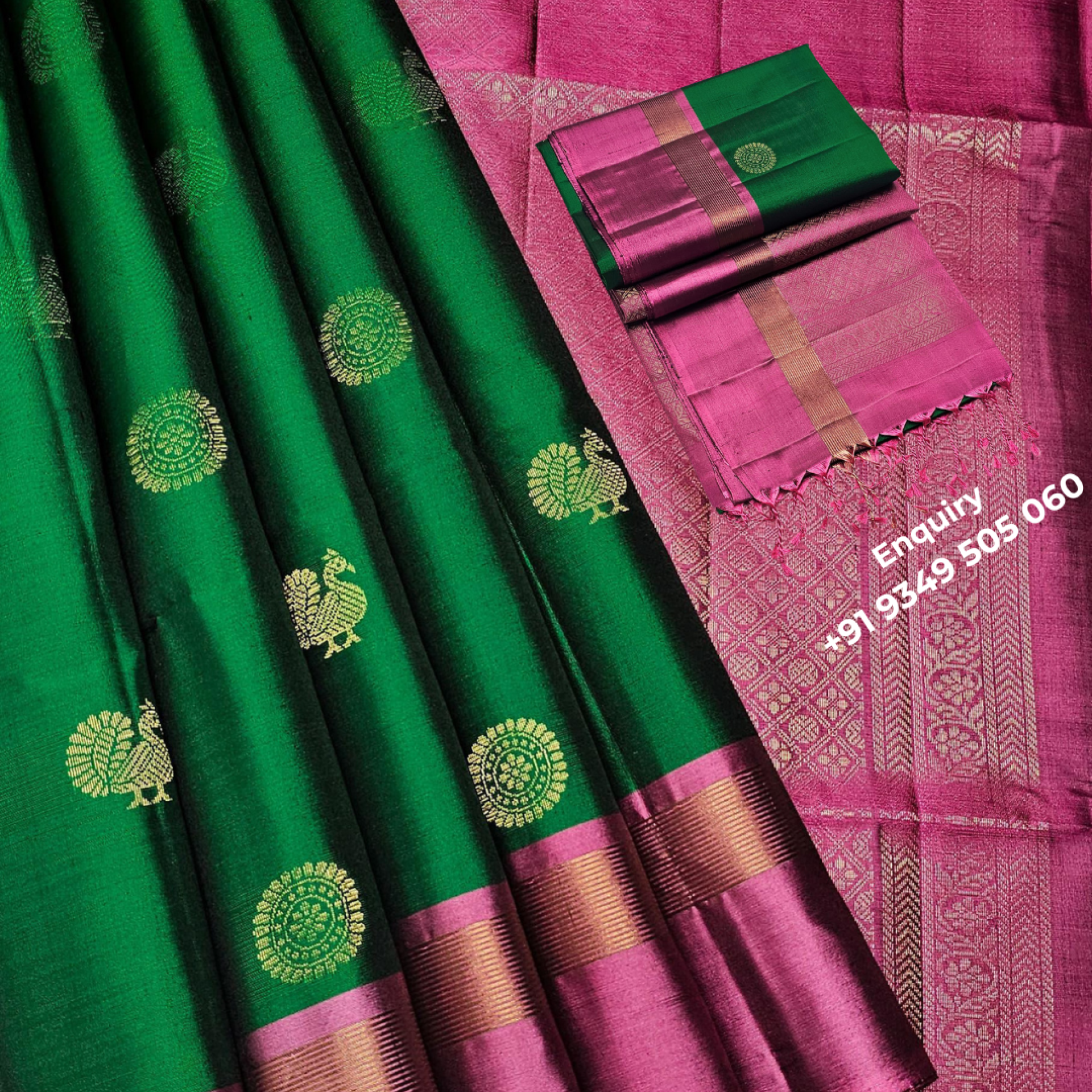 For those who adore calm and muted elegance, this pastel green silk saree with charcoal grey border is the ultimate choice. Featuring vertical floral zari buttas that run across the pleats, this saree is a graceful option for office parties, casual functions, or minimal weddings.