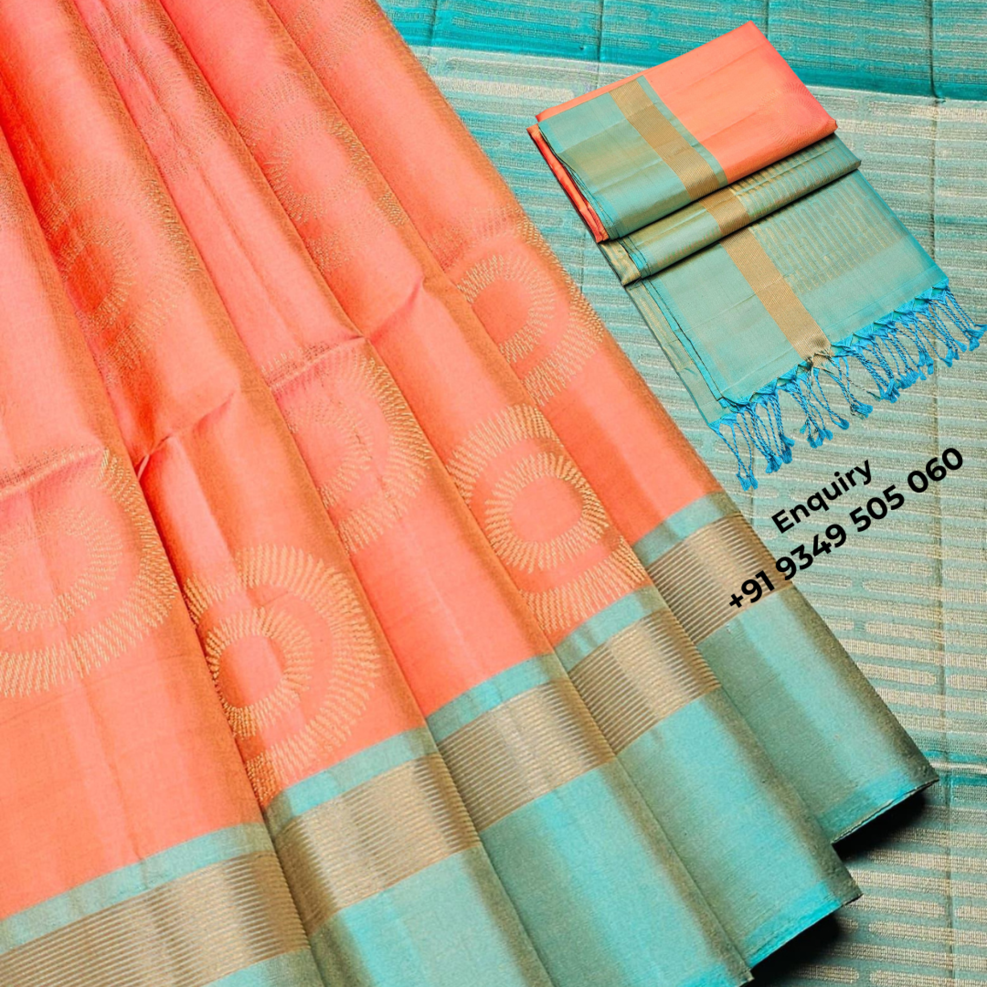 - This peach and sea green silk saree is a pastel lover's dream. Woven with delicate golden zari motifs arranged in graceful circular patterns, the saree is lightweight, breezy, and radiates understated charm. The dual-tone pallu and border in soft sea green add a refined finish, making this saree ideal for day functions, weddings, and special occasions.