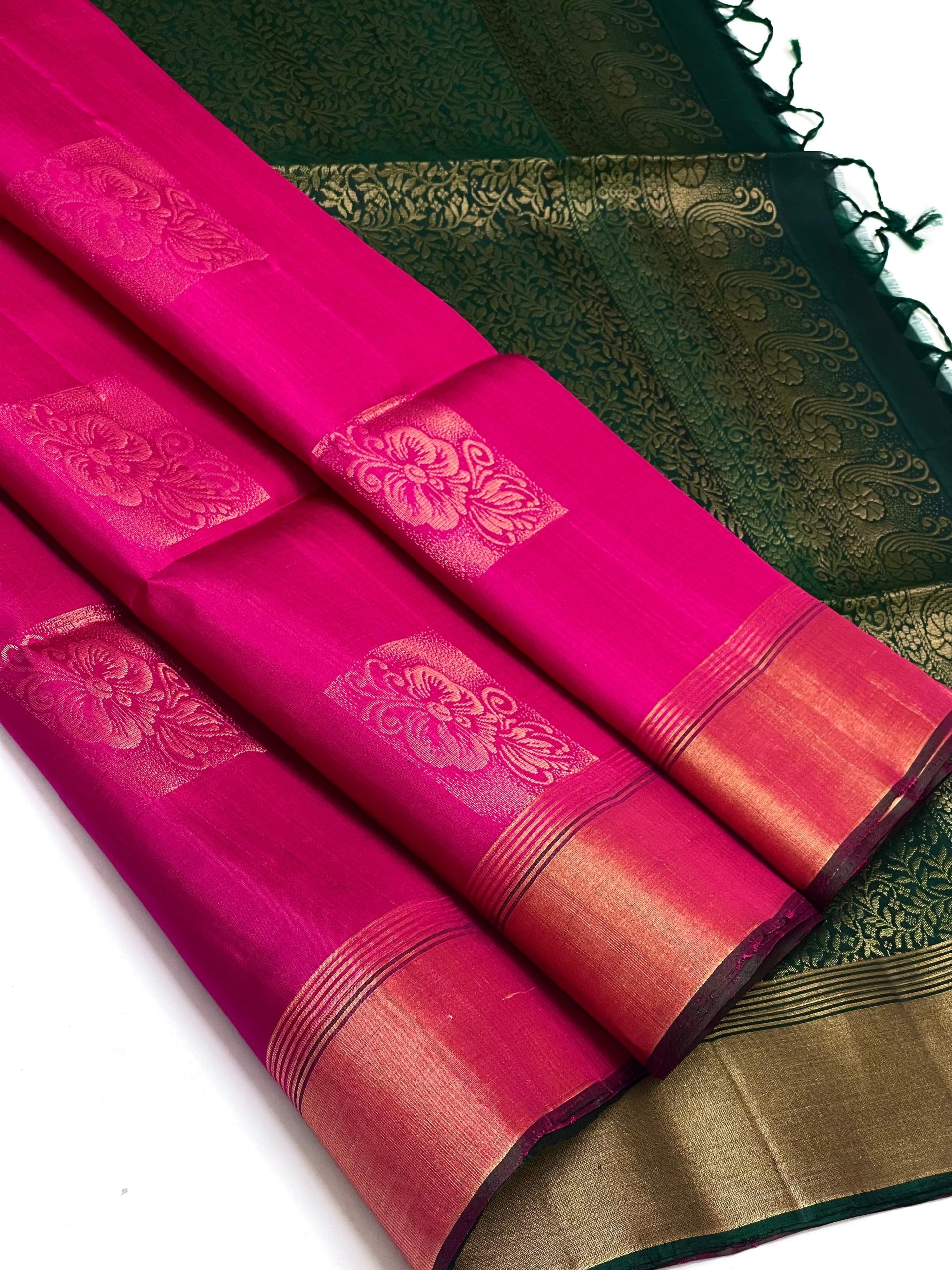 A bright magenta saree enhanced with large floral motifs and a contrasting bottle green pallu – perfect for making a statement.