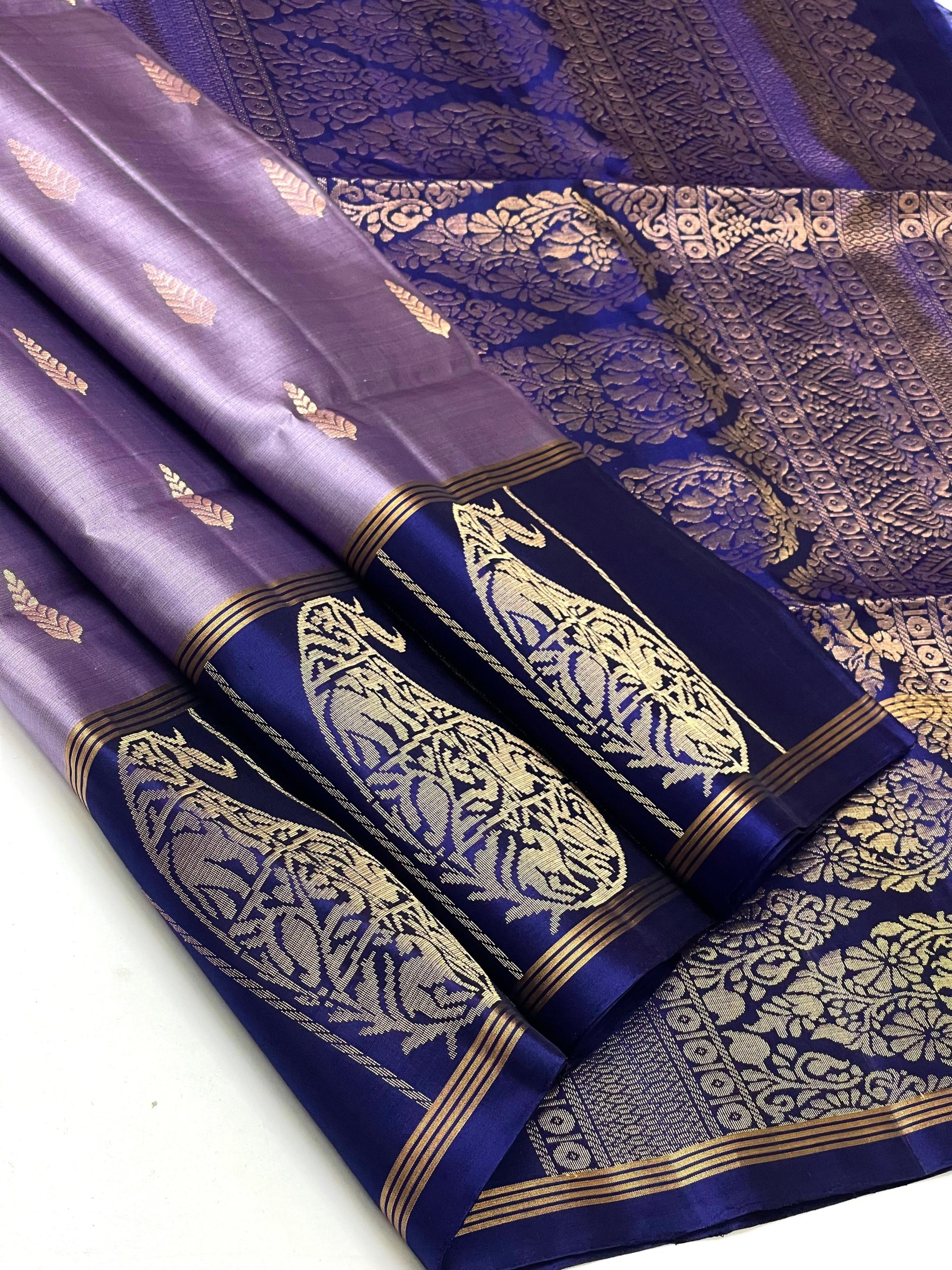 This lavender-pink Soft Silk Saree with deep navy blue zari borders brings an enchanting glow to any occasion. The elaborate floral pallu and signature motifs showcase traditional artistry in every thread.