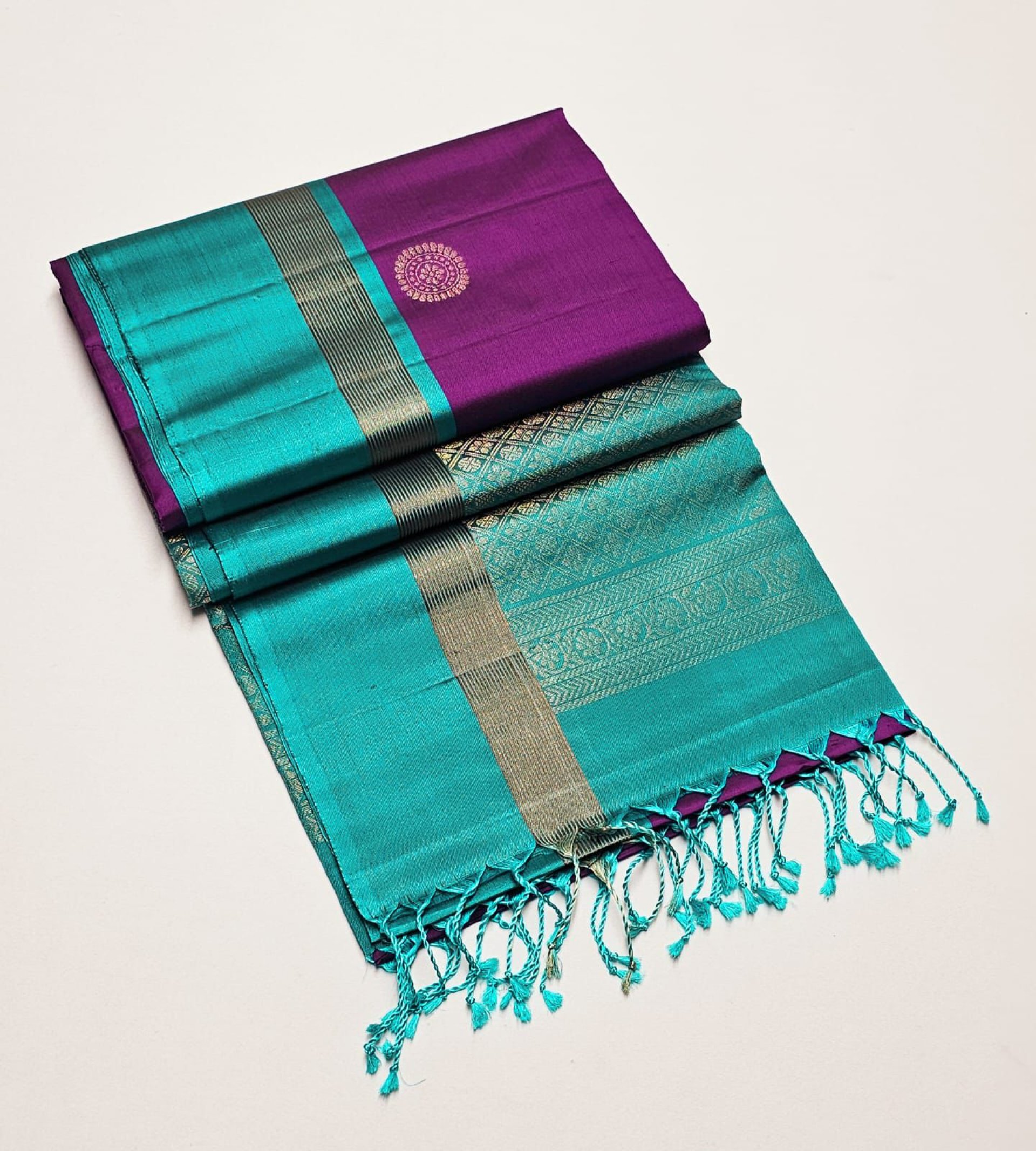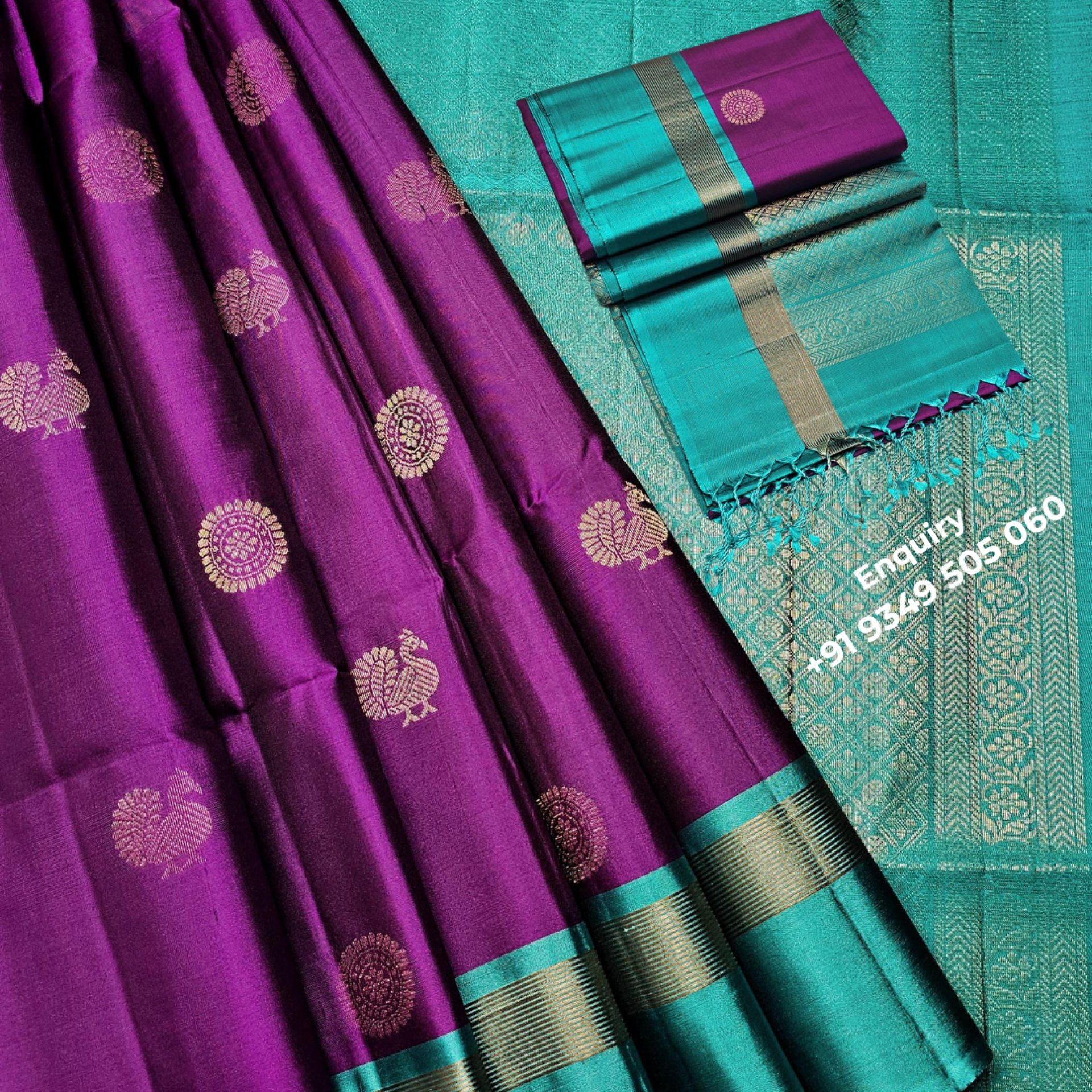 Add a regal touch to your ethnic collection with this exquisite Royal Purple & Teal Green Kanchipuram Silk Saree. Woven with rich silk and beautifully adorned with intricate golden peacock and floral zari motifs, this saree features a striking teal green border and grand pallu. Comes with a matching blouse piece, making it the perfect choice for weddings, festive gatherings, and traditional functions.