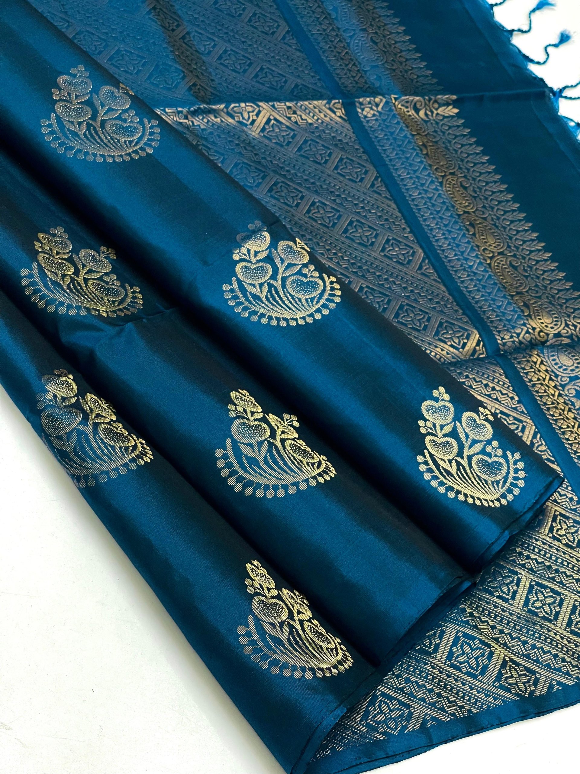 Gracefully elegant, this peacock teal soft silk saree features gold floral buttas and a traditionally rich zari border. A timeless piece suited for festive evenings and family occasions.