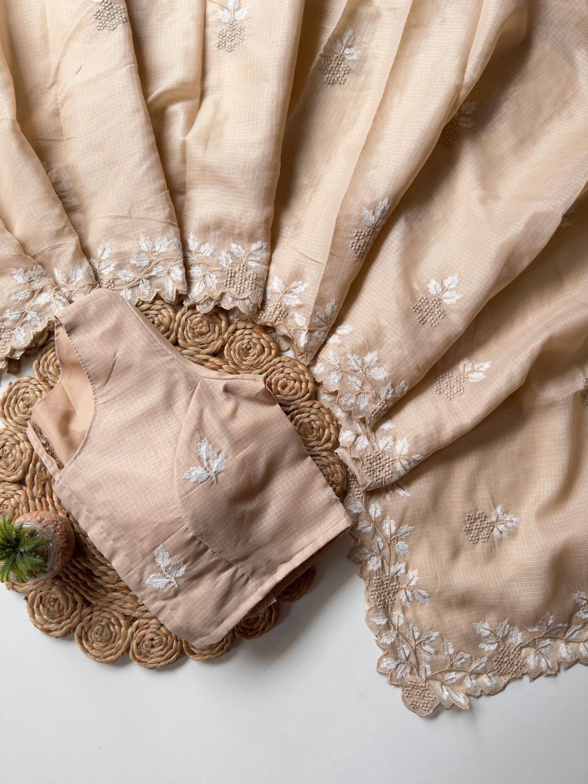Exude elegance and understated charm in this soft beige organza saree, featuring delicate white floral thread embroidery across the body and scalloped border. The light, translucent organza adds a graceful flow, making it ideal for day events, brunches, or intimate celebrations.