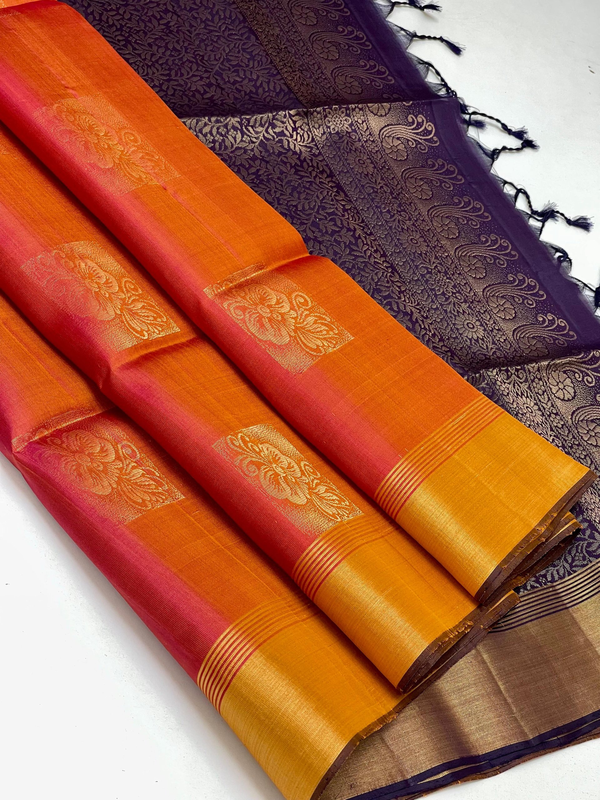 A fiery blend of deep orange and magenta gives this saree a bold and festive appeal, with golden floral buttas and a detailed violet pallu.