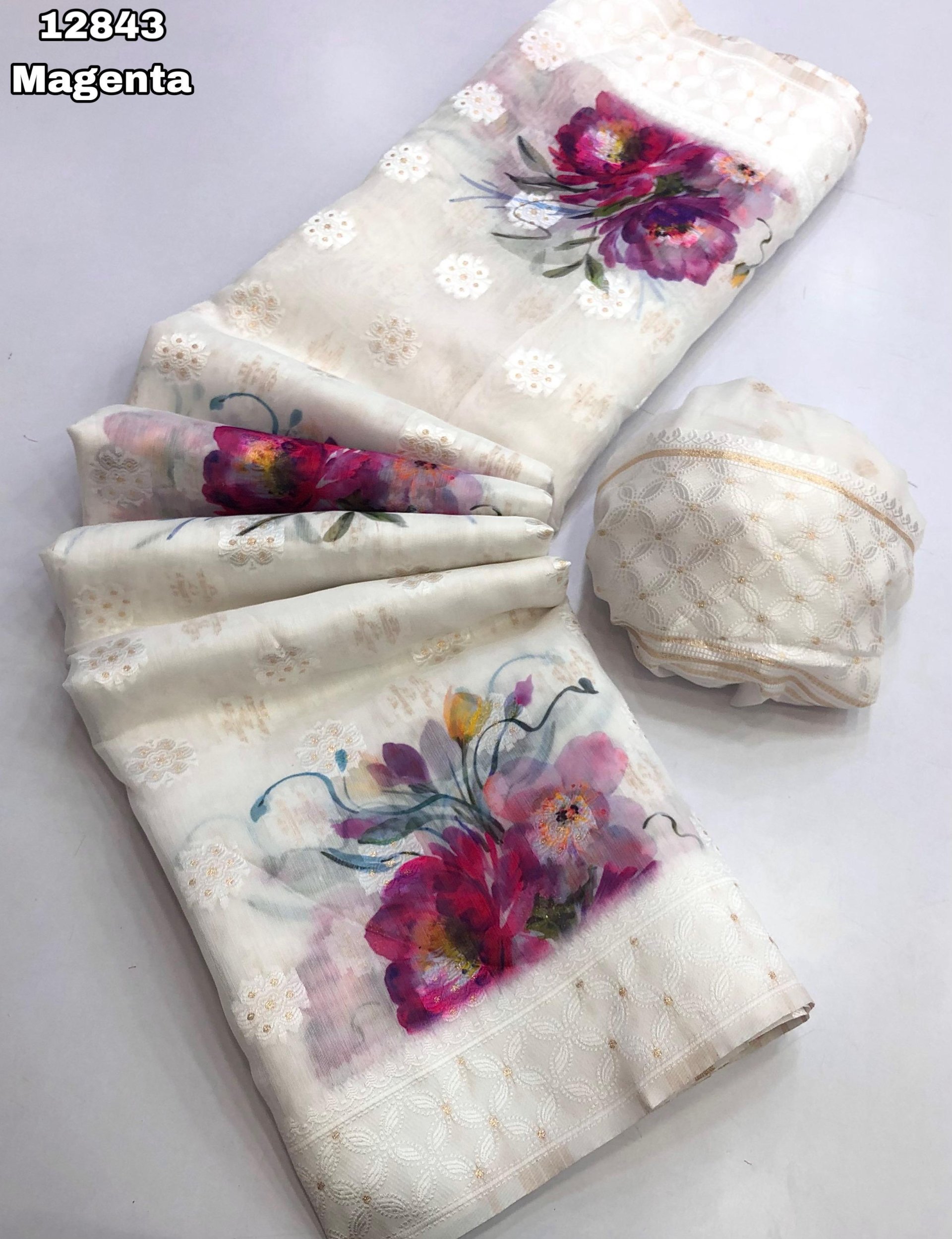 Turn heads in this enchanting white organza saree, adorned with vibrant magenta floral prints and elegant white embroidered buttas throughout the body. The sheer fabric brings a light, graceful drape while the floral designs add a touch of modern romance to this traditional piece.